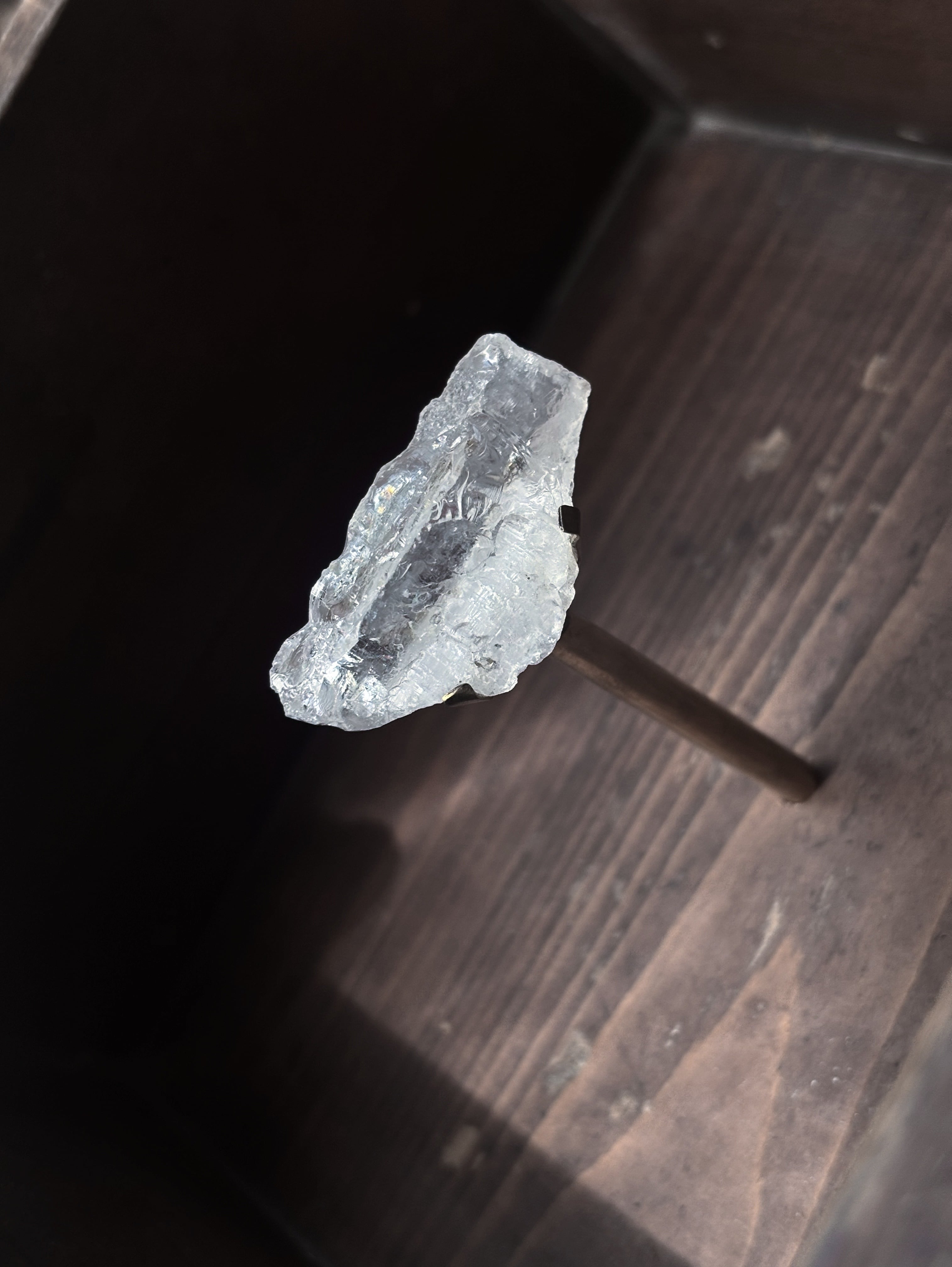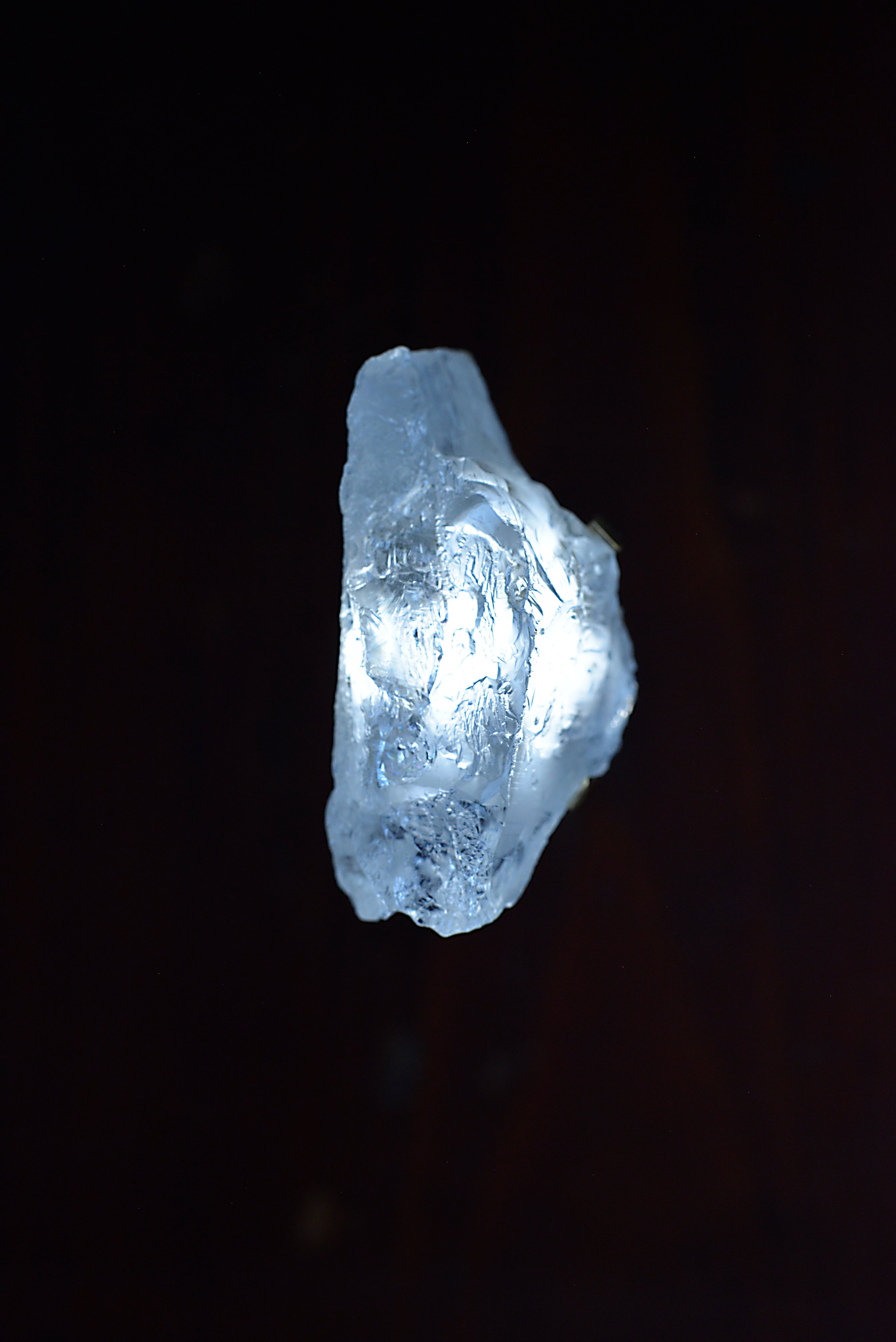 非常に透明度が高く、まるでかち割り氷のような特徴的な水晶灯です。亀裂が浮かび上がる様が魅力的。中心部から放たれる光が美しく、凍りついた氷のような結晶部で優しく拡がります。